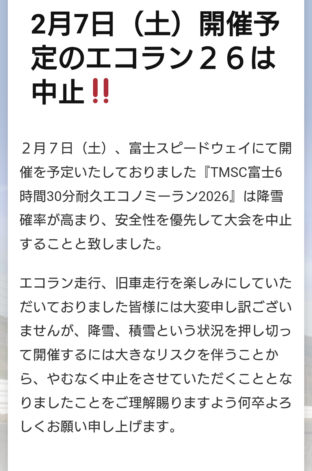 お世話になっております。 L-TECH大杉タカハシです。 何と富士のエコランが雪の為中止…
