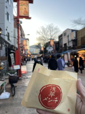 イチゴ大福と浅草メンチ、揚げ饅頭もんじゃ味を頬張りました🍽️🍽️🍽️